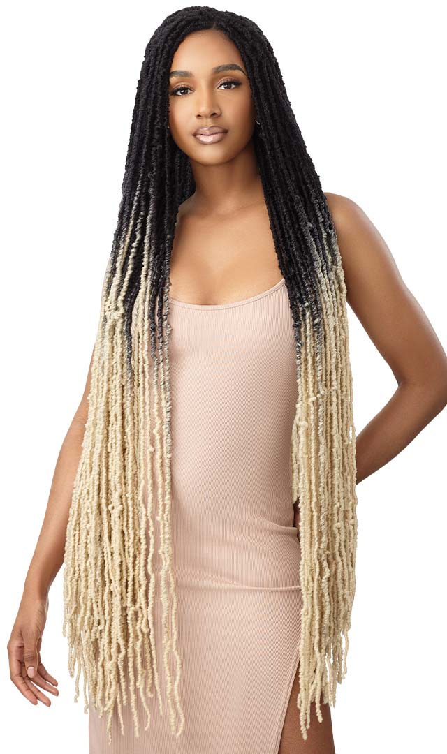 Web Copper Colored Faux Locs. Web Blonde locs paired with a gold hair accessory make this simple half-up.