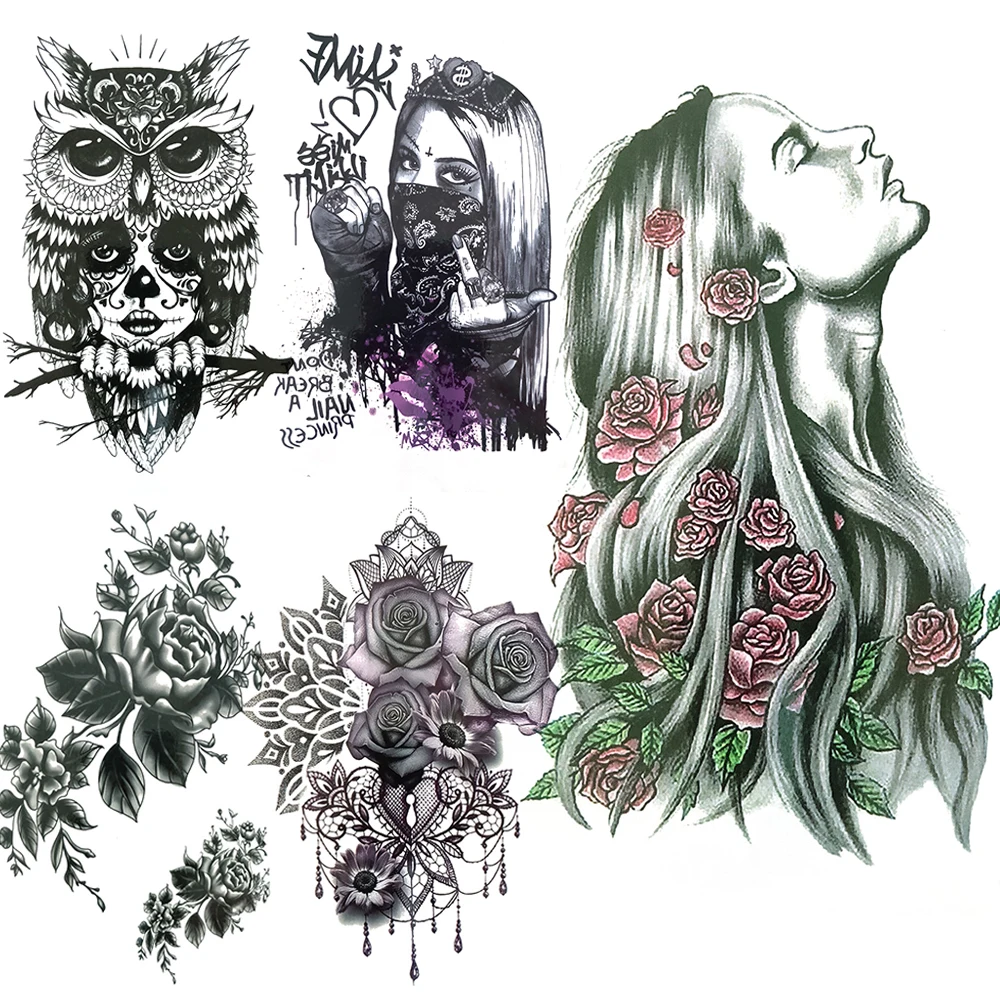Kupit Tatuirovka I Bodi Art Large Harajuku Fake Temporary Tattoo For Female Men Owl Gangster Tattoo Rose Jasmine Flowers Waterproof Tatoo Masked Women Hands